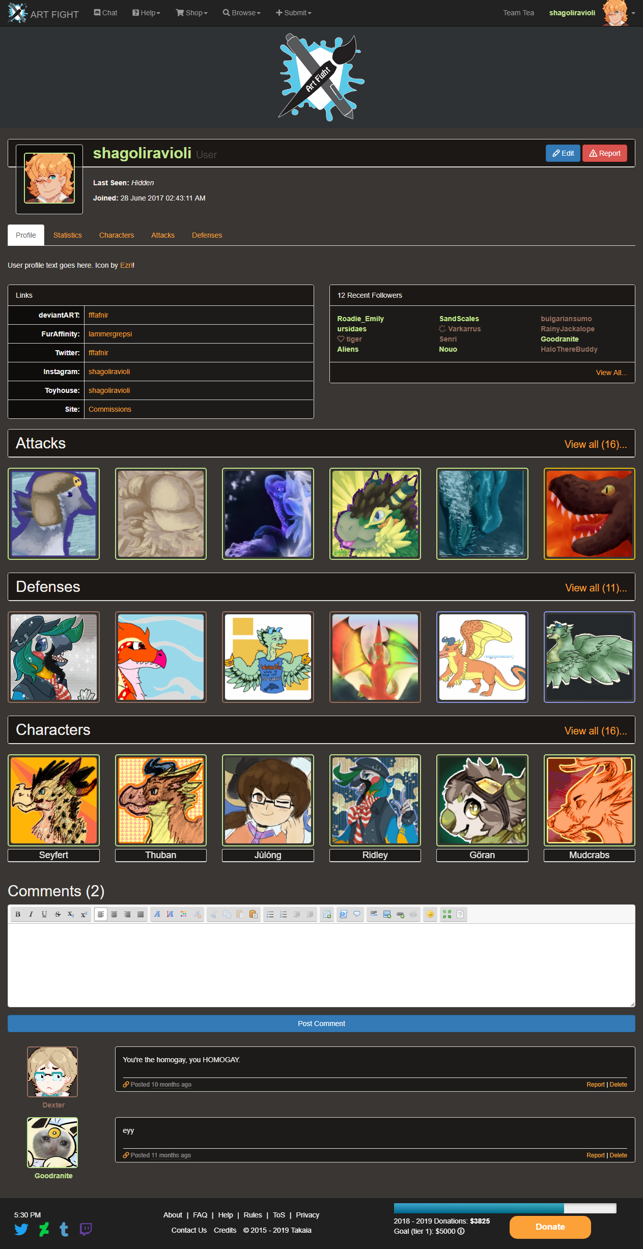 A simple theme whipped up in a few days’ time to darken most surfaces on Art Fight dot Net. In addition to the dark background with light hyperlinks, panels are made a translucent black, borders are made solid until hovered over, and hyperlink transitions have a smooth delay. This applies to all pages on the domain.